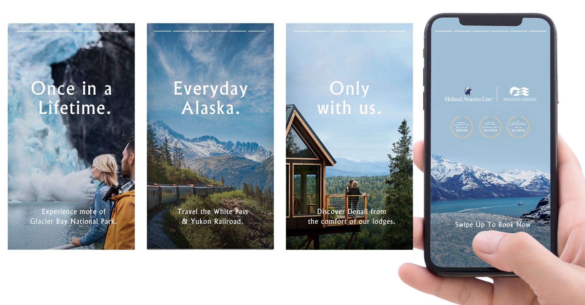 This series of banners and billboards was designed to contrast the man-made environment viewers are currently in with the awe-inspiring natural wonders awaiting them in Alaska. The campaign showcases stunning photography of Alaska’s landscapes, some featuring our actual tour guides to create an authentic and relatable connection with potential travelers. The goal was to inspire viewers to envision themselves exploring Alaska's untouched beauty, positioning the destination as a must-see, life-changing experience. By leveraging these contrasting visuals, the campaign aimed to generate excitement and drive bookings for Princess Cruises and Holland America Line. As one of the designers on this collaborative effort I was responsible for concept development, layout design, and execution using Adobe Photoshop and Illustrator.