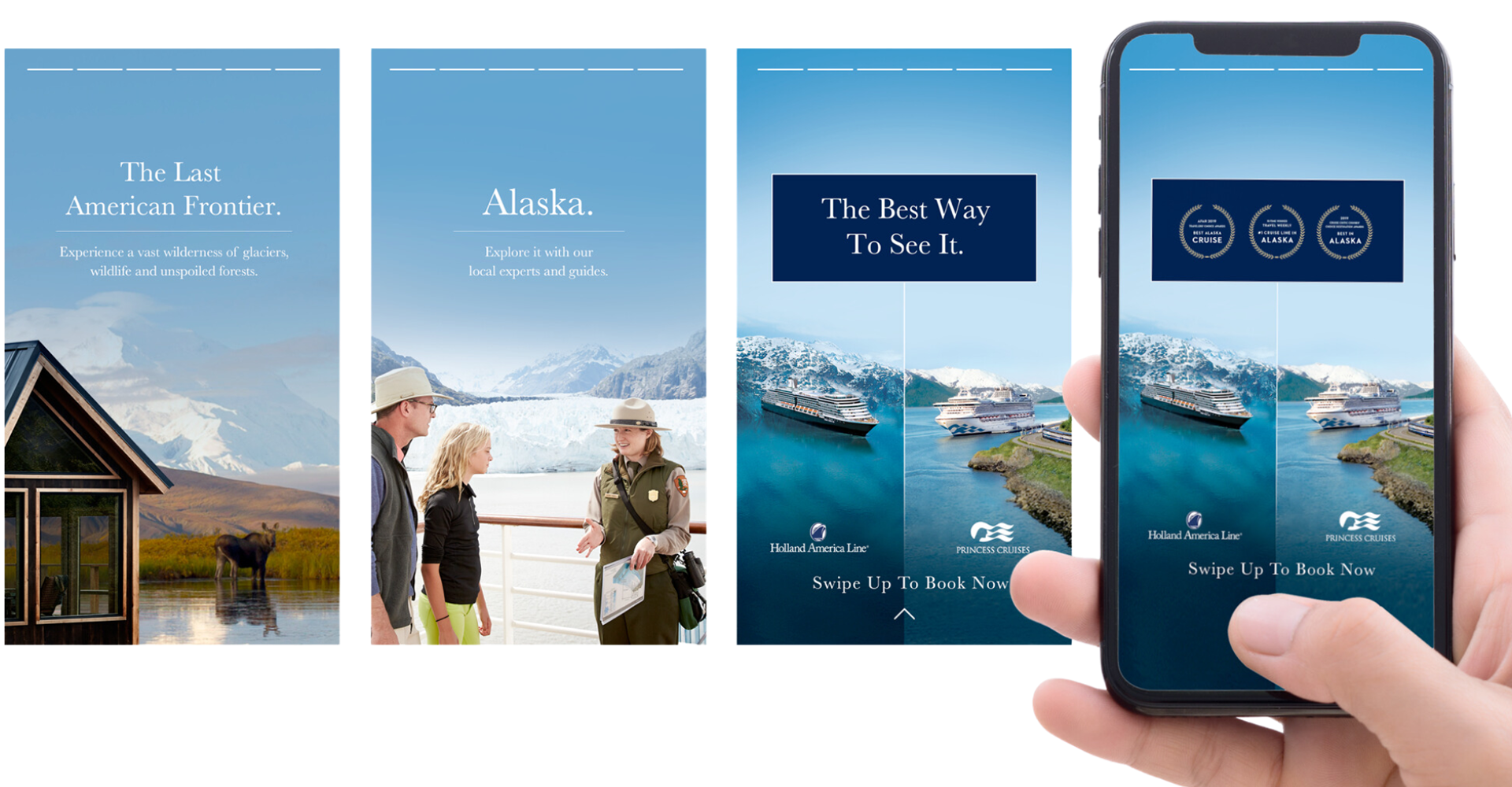 Our objective was driving consumer demand for Alaska cruises by way of a joint "Alaska Adventure Campaign" with HAL and Princess Cruises. The campaign’s goal was to address key consumer questions: Why visit Alaska this year? Why choose Princess or Holland America Line? Why book now? The creative focus was on enticing consumers to book their trips by highlighting the unique appeal of Alaska and the unparalleled experiences provided by these cruise lines. The campaign was used across print, digital, and social channels to capture attention and increase bookings.
